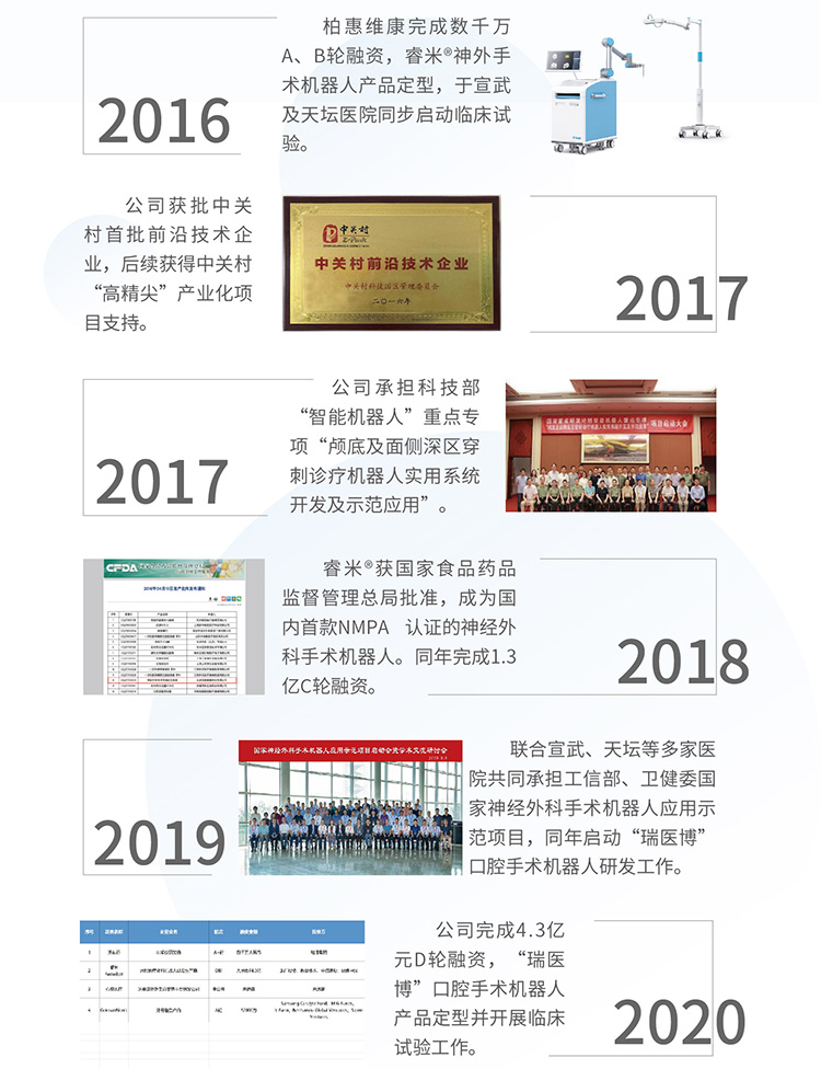 北京柏惠維康科技股份有限公司創(chuàng)立于2010年,是專業(yè)從事手術(shù)機(jī)器人研發(fā)、生產(chǎn)、運(yùn)營的國家高新技術(shù)企業(yè),國家專精特新“小巨人”企業(yè)、中國醫(yī)療裝備人工智能聯(lián)盟理事單位、中關(guān)村前沿科技與產(chǎn)業(yè)服務(wù)聯(lián)盟理事單位。